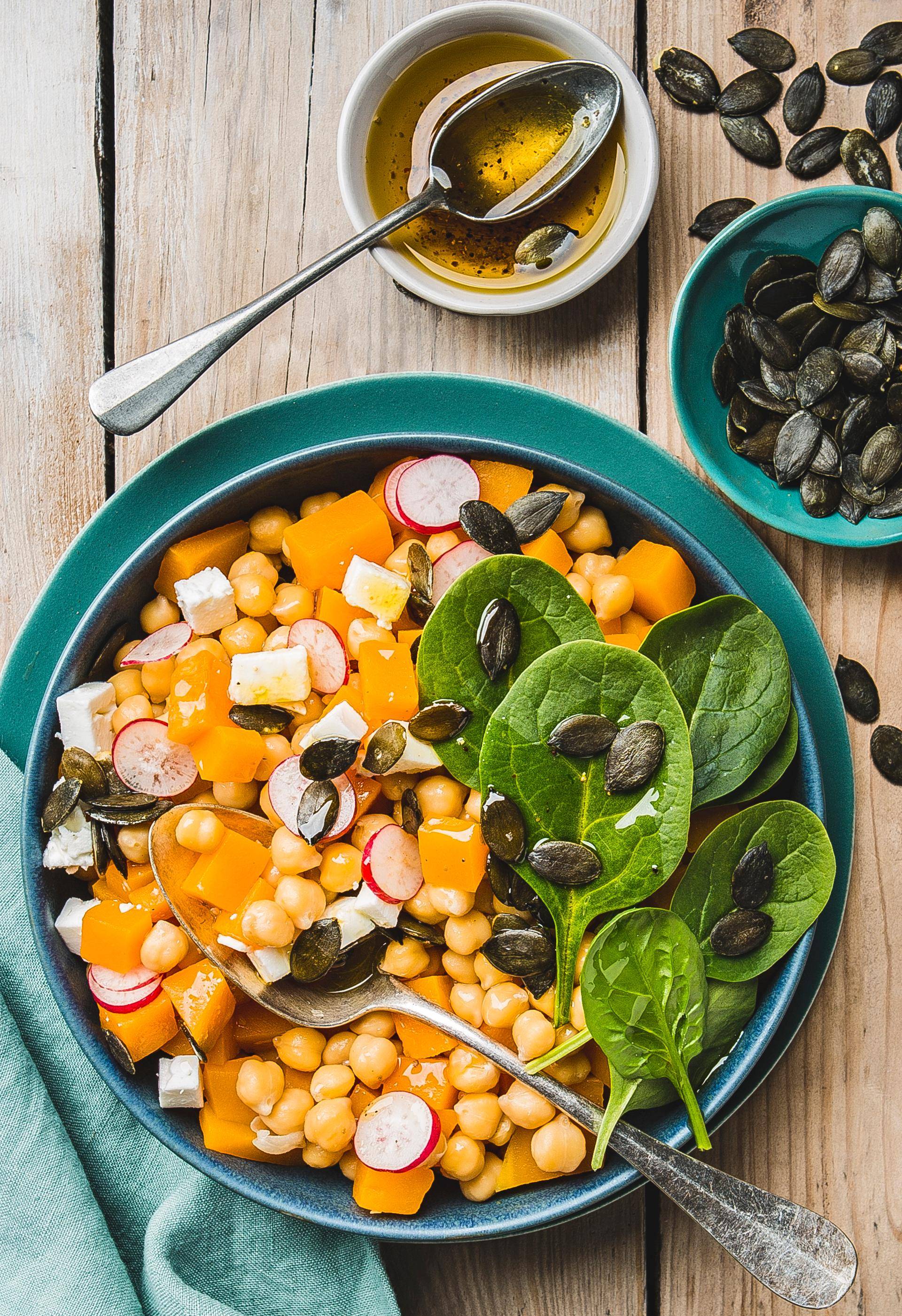 Dans un saladier, mettez les pois chiches, les dés de butternut, la feta émiettée et les graines de courges.