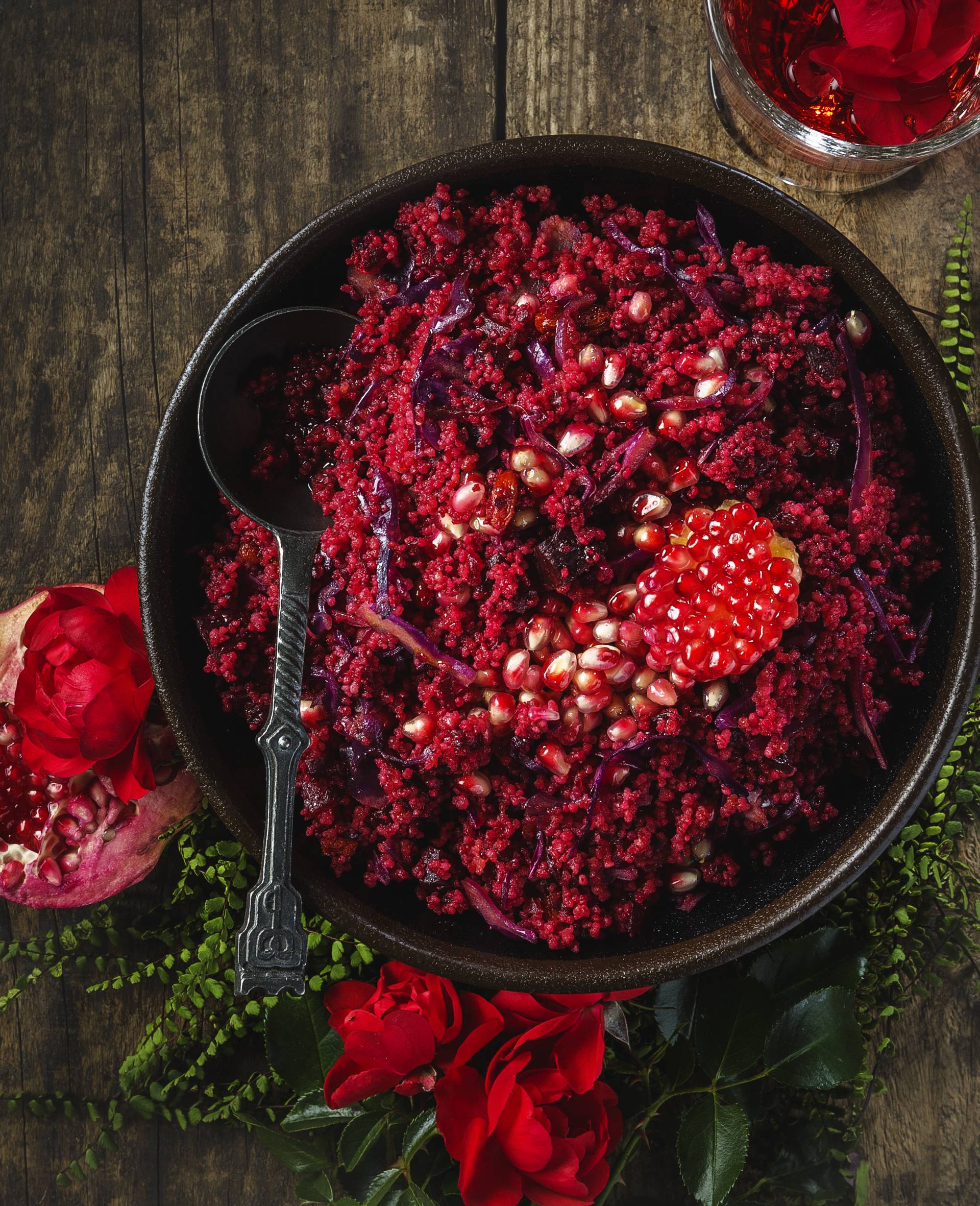 Hacher grossièrement au couteau les betteraves. Les mettre dans un saladier avec leur jus, ajouter la semoule, le chou rouge, les graines de la grenade, 100 ml d’eau, le sel, l’huile et le vinaigre. Mélanger.