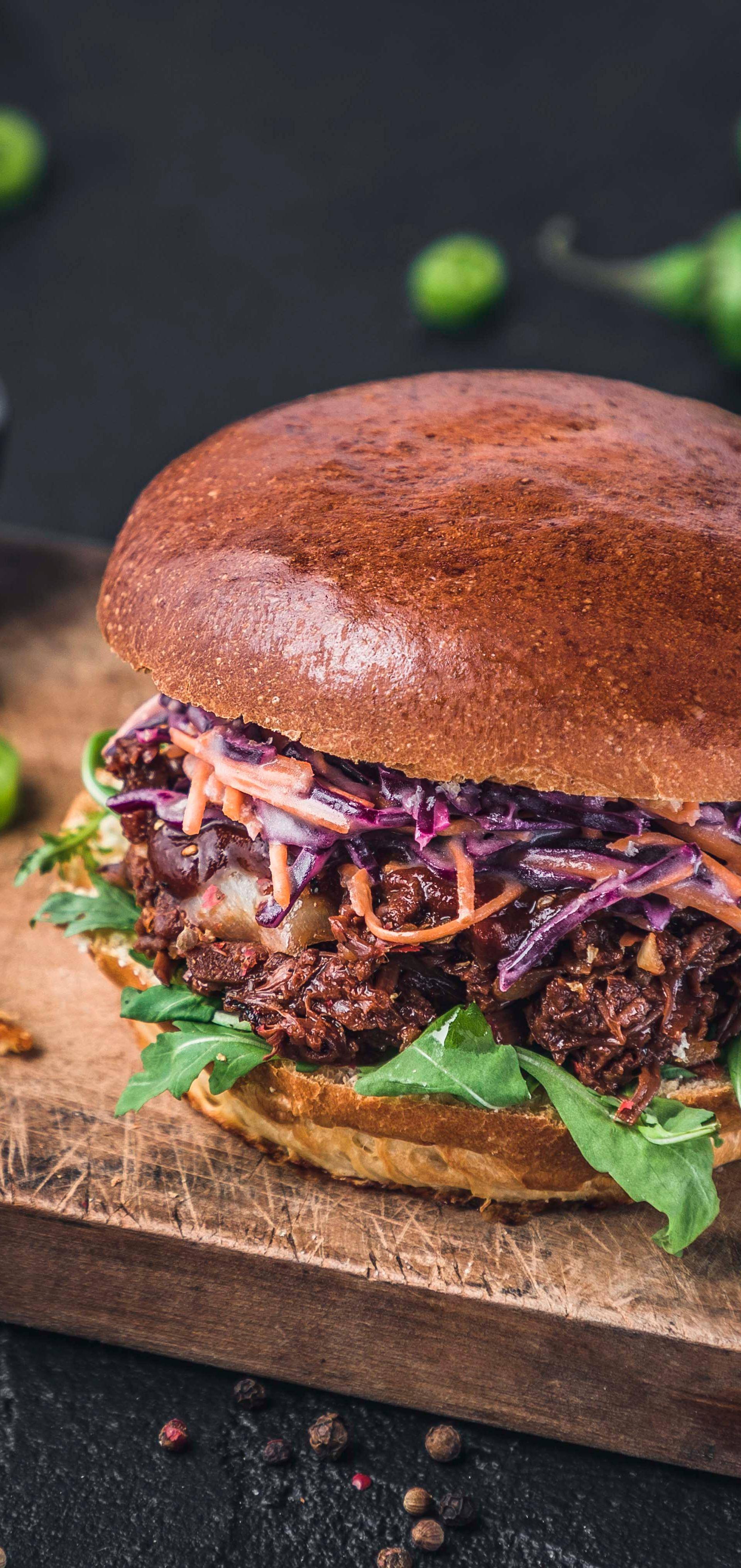 Réchauffer légèrement les pains à burger au four à 160°C pendant 10 min. Répartir dans les burgers quelques feuilles de coriandre, le fruit du jacquier et les crudités marinées. Refermer et déguster aussitôt.