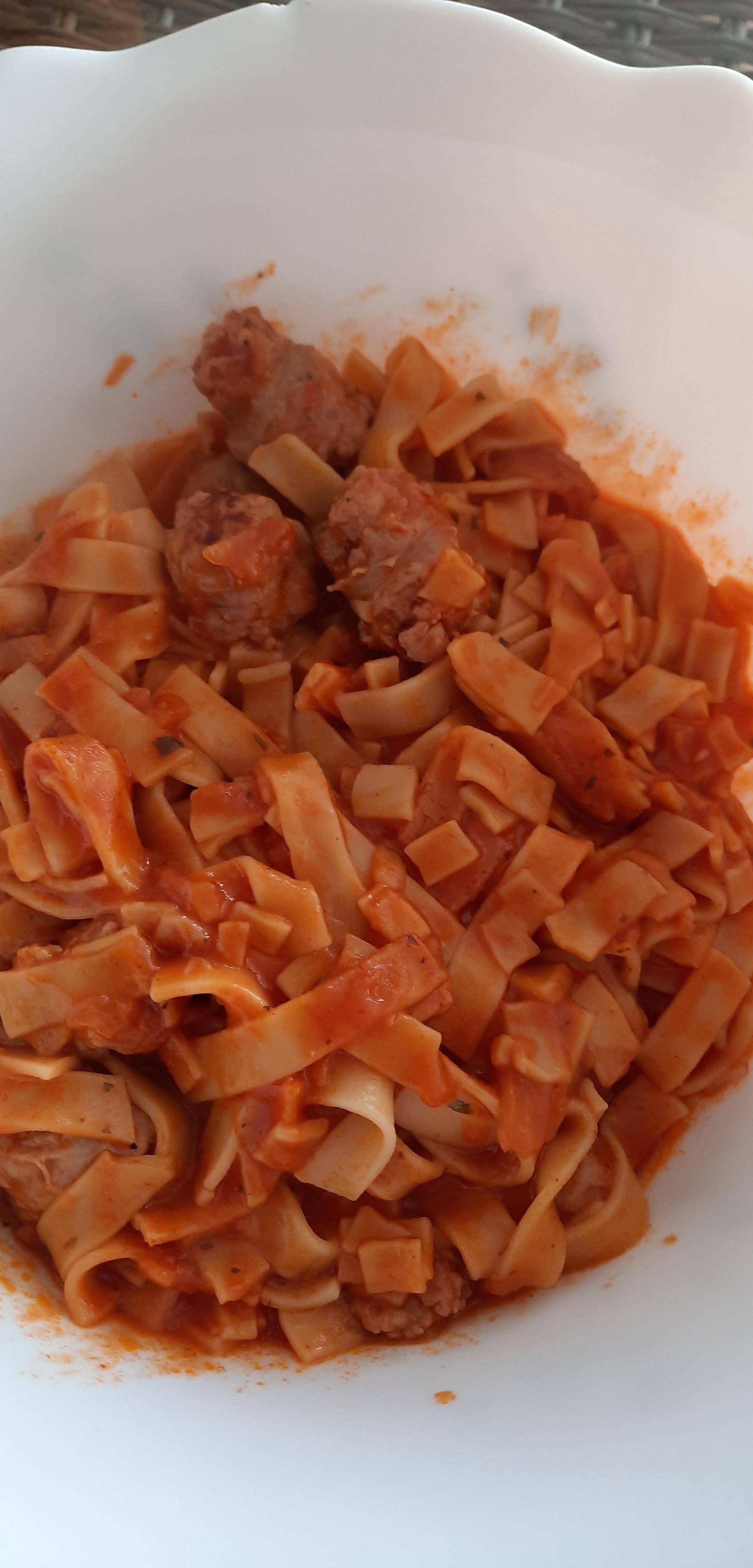 Mélangez les pâtes avec de la sauce tomate au saucisses et au oignons .