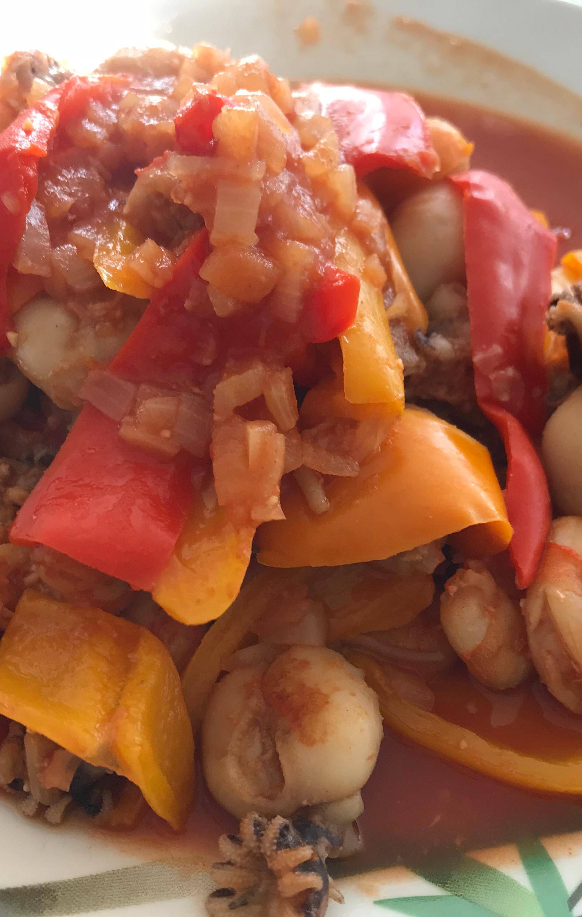 Faire decongeler les seiches si elles sont surgelées. Pendant ce temps, décortiquer les crevettes. Émincer l’oignon et couper les poivrons en lanières.