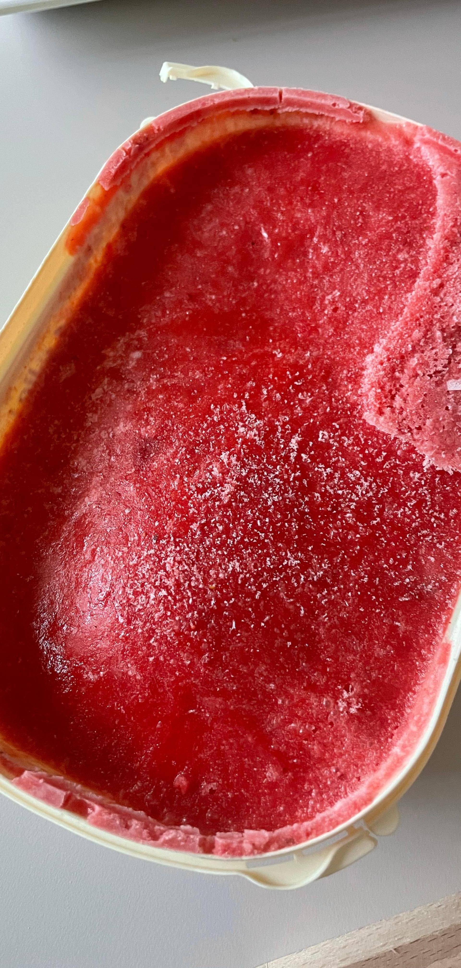 Verser dans un bac hermétique et placer au congélateur pendant au moins 8h. La préparation permet d’obtenir un peu plus d’1L de sorbet.