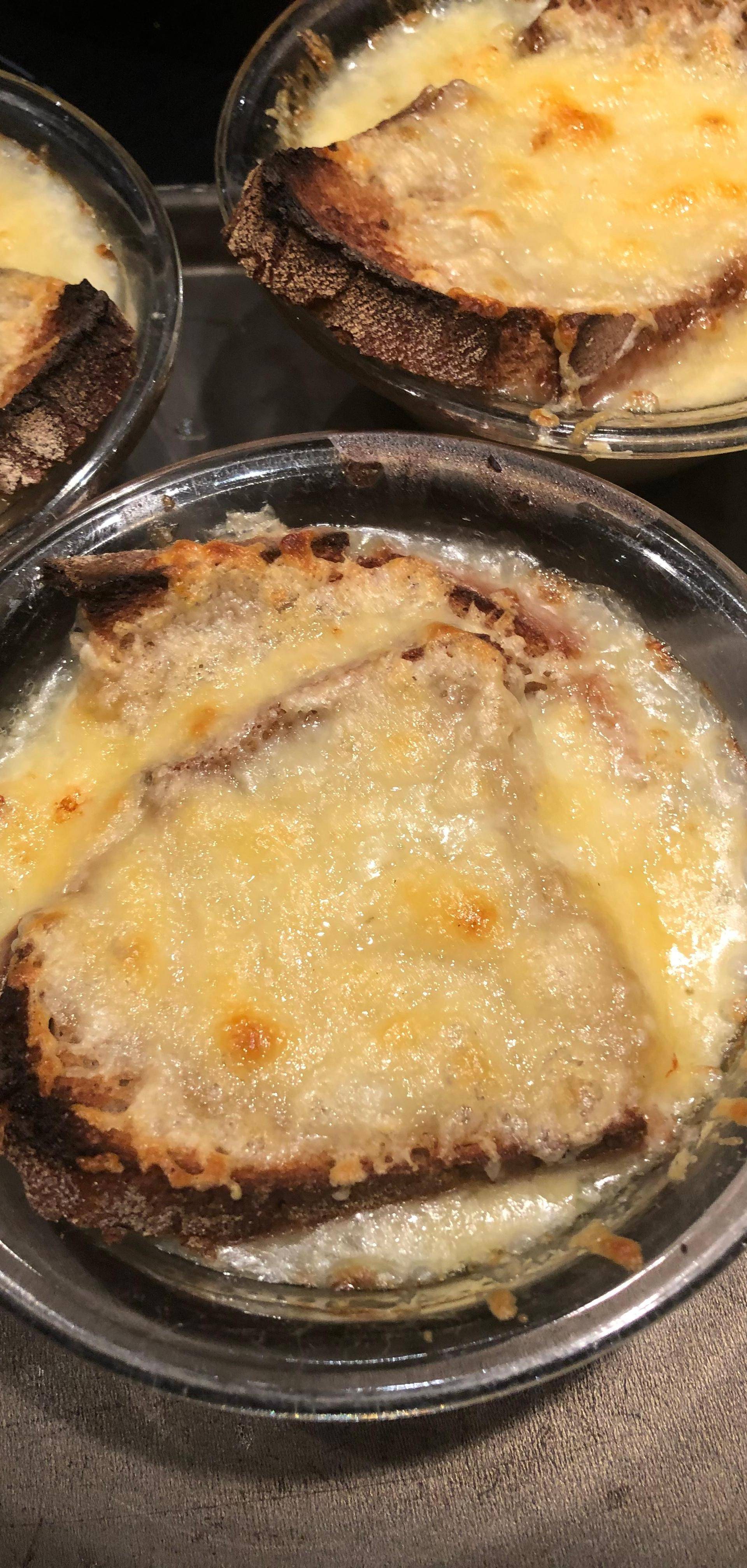 Prechauffer le grill du four à 280 degrés . Repartir la soupe dans de petites cocottes ou des bols passant au four . Ajouter une tranche de pain de campagne sur la soupe et couvrir généreusement de comté. Faire gratiner 5 min et servir chaud