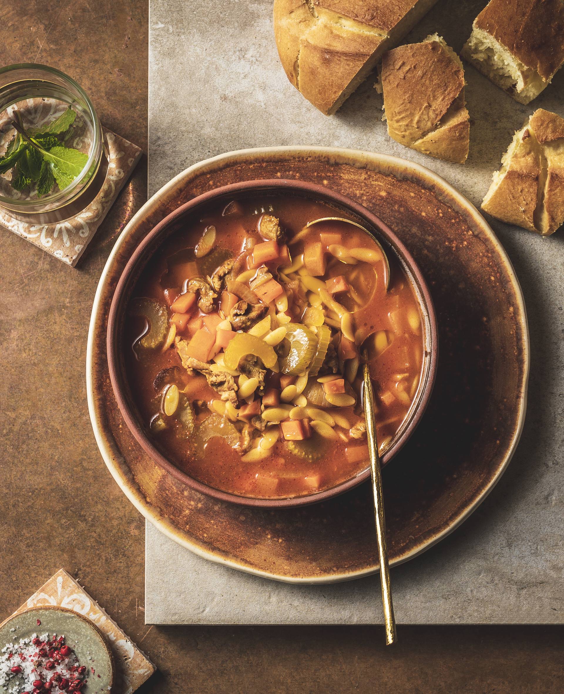 Faire dorer l’oignon. Ajouter la viande, l’ail, les épices, la carotte et le céleri. Faire dorer 1 min.
