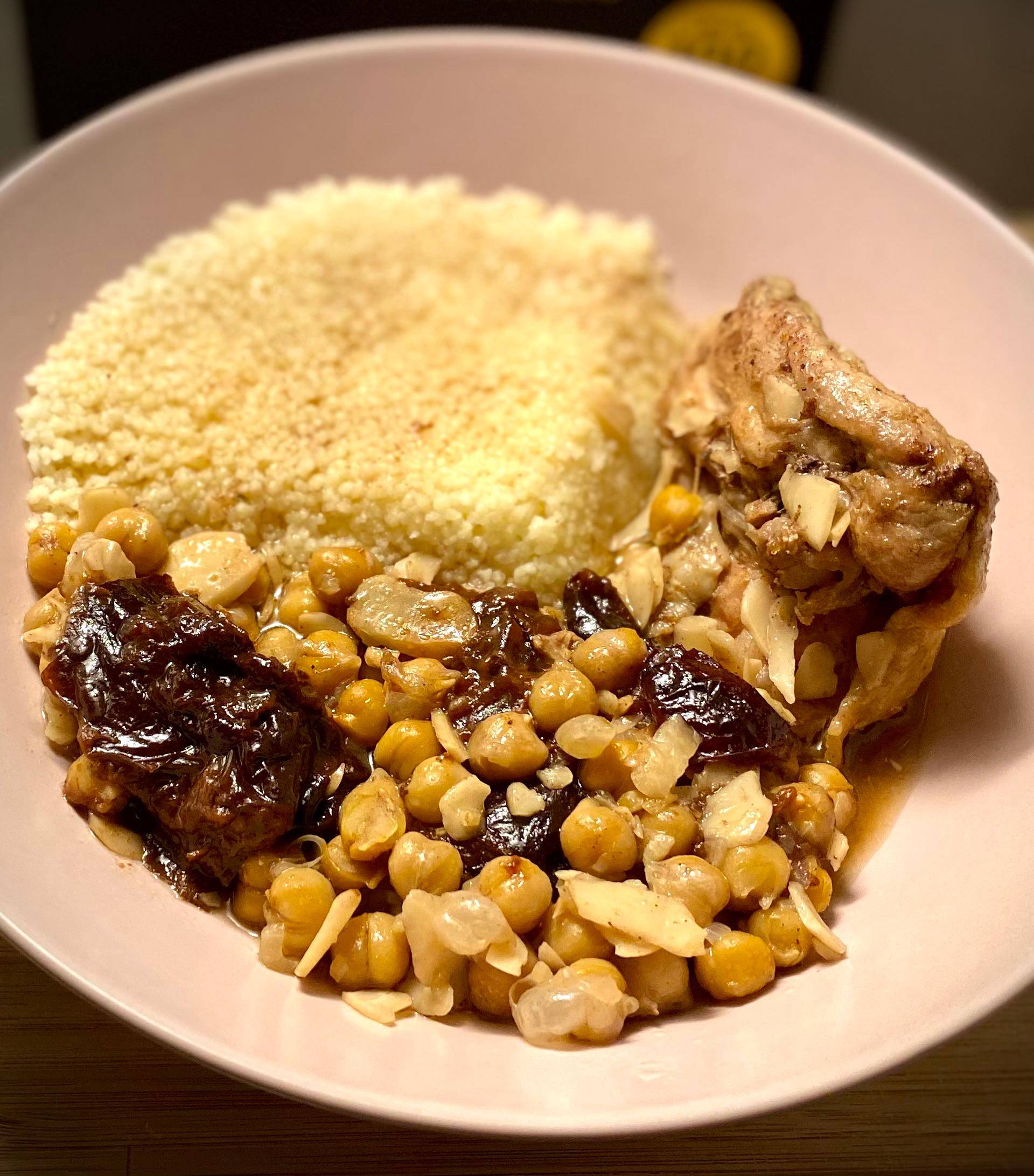 Tajine de poulet, pruneaux, amandes, pois chiches