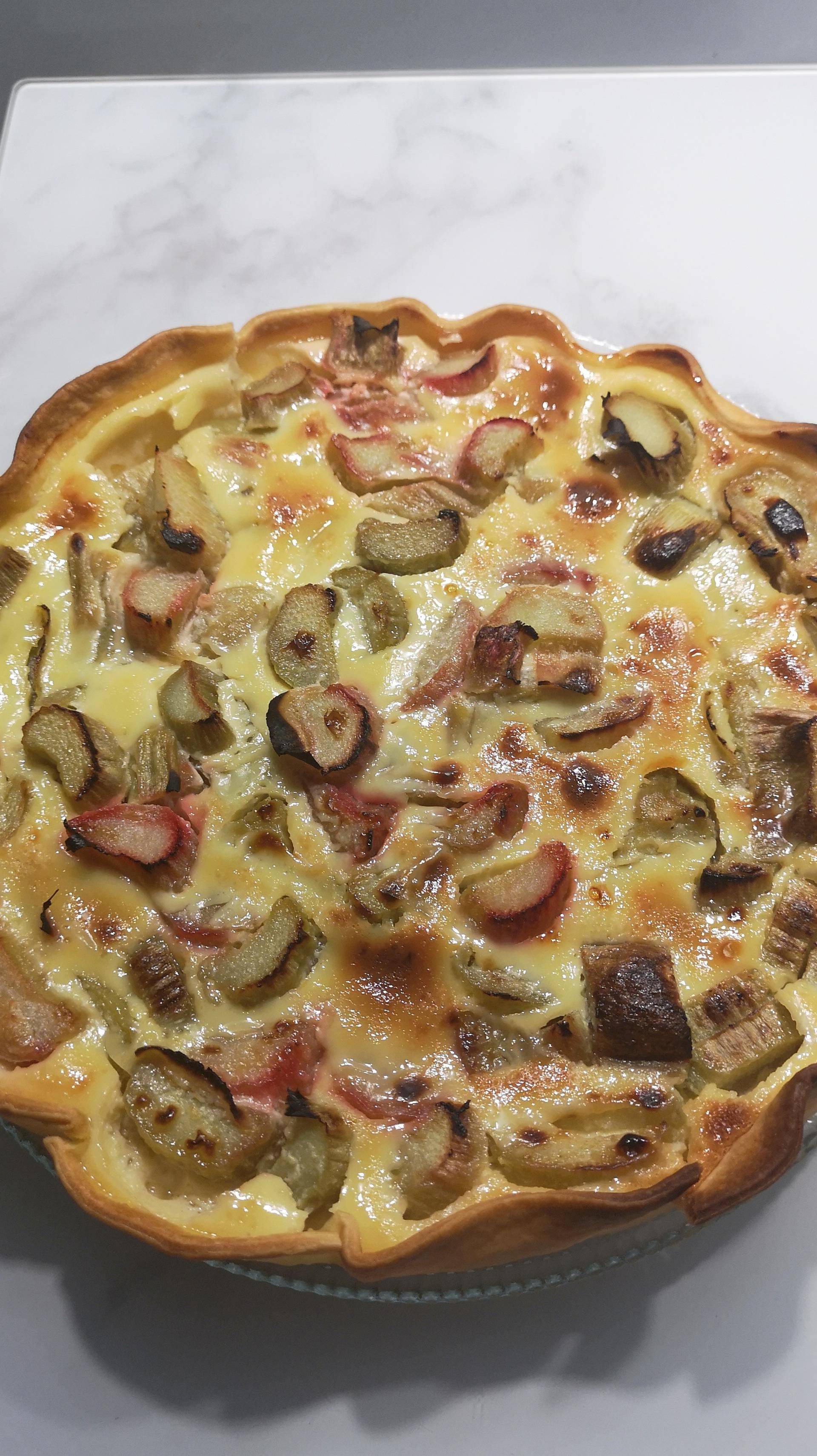 Étaler les morceaux de rhubarbe sur la pâte puis recouvrir avec la préparation. Enfourner 25mn environ selon le four.