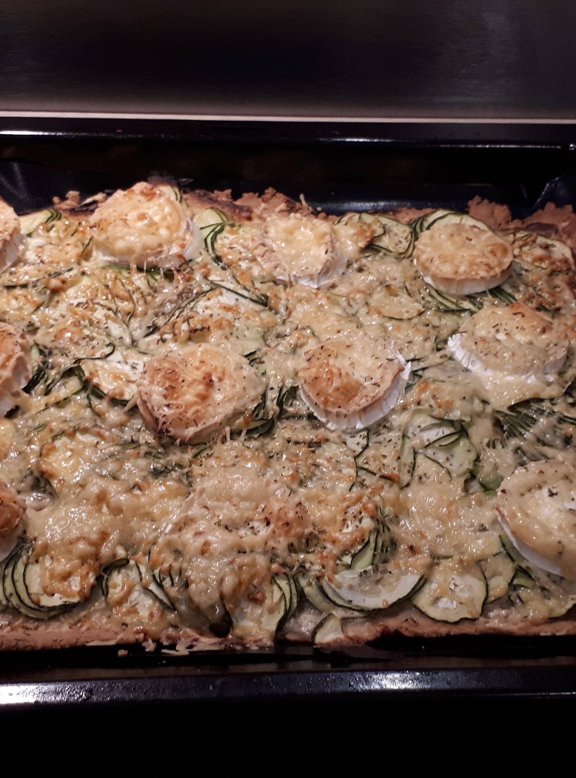 Découpez un papier cuisson de la taille de la plaque à pizza. Déroulez la pâte feuilletée sur le morceau de papier cuisson et utilisez-le comme guide : piquez la pâte à l'aide d'une fourchette, étalez la préparation au fromage au centre, sans dépasser la taille du papier cuisson. Ajoutez les rondelles de courgettes par-dessus, le reste du thym et de l'huile et rabattez les bords de la pâte sur la garniture, de façon à ce que la tarte ne dépasse plus du papier cuisson.