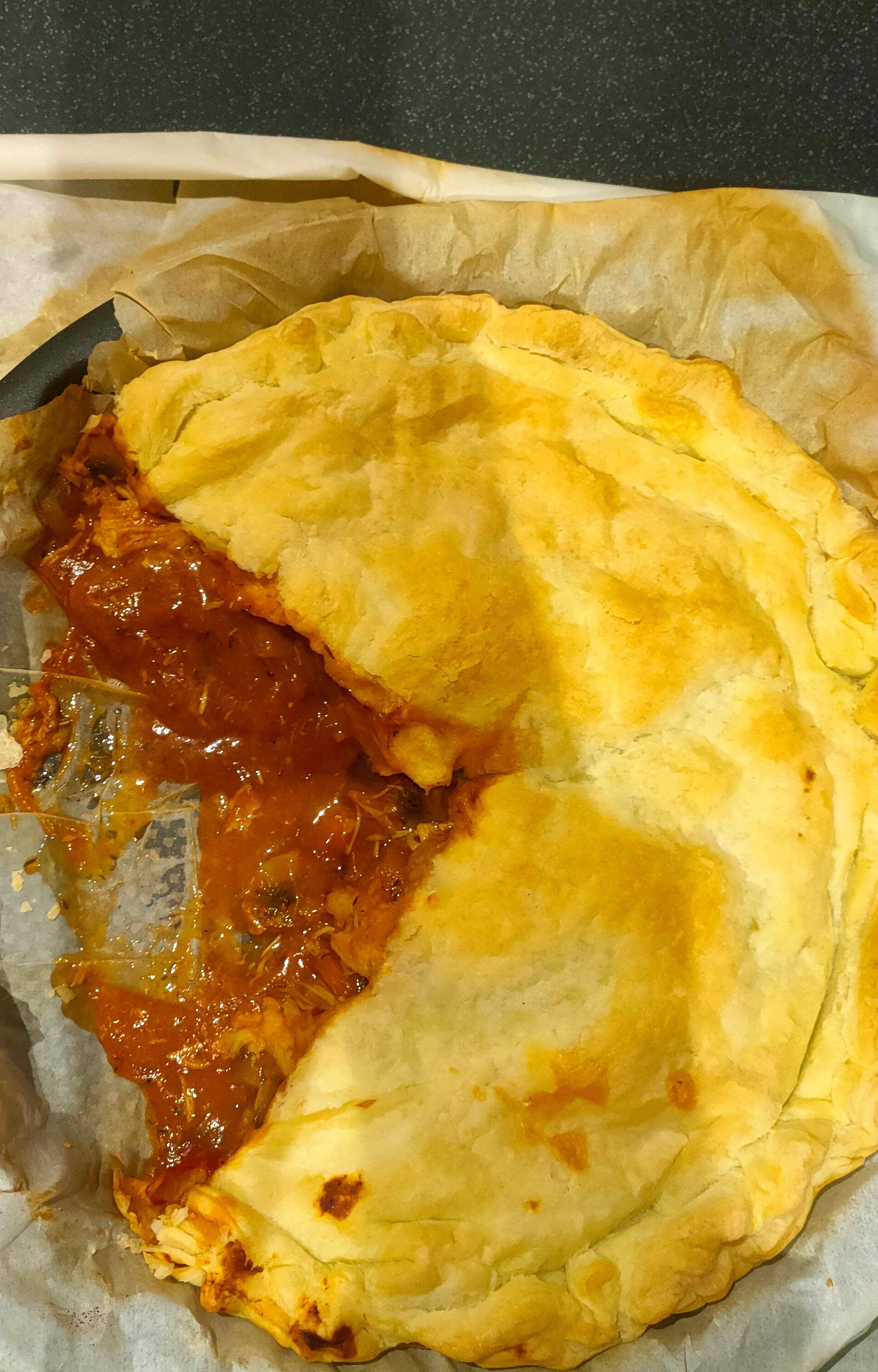 Une fois refroidi, mettre une pâte feuilletée dans un plat, la farce et la seconde pâte feuilletée. Cuisson à four chaud à 180 pendant 20-30min