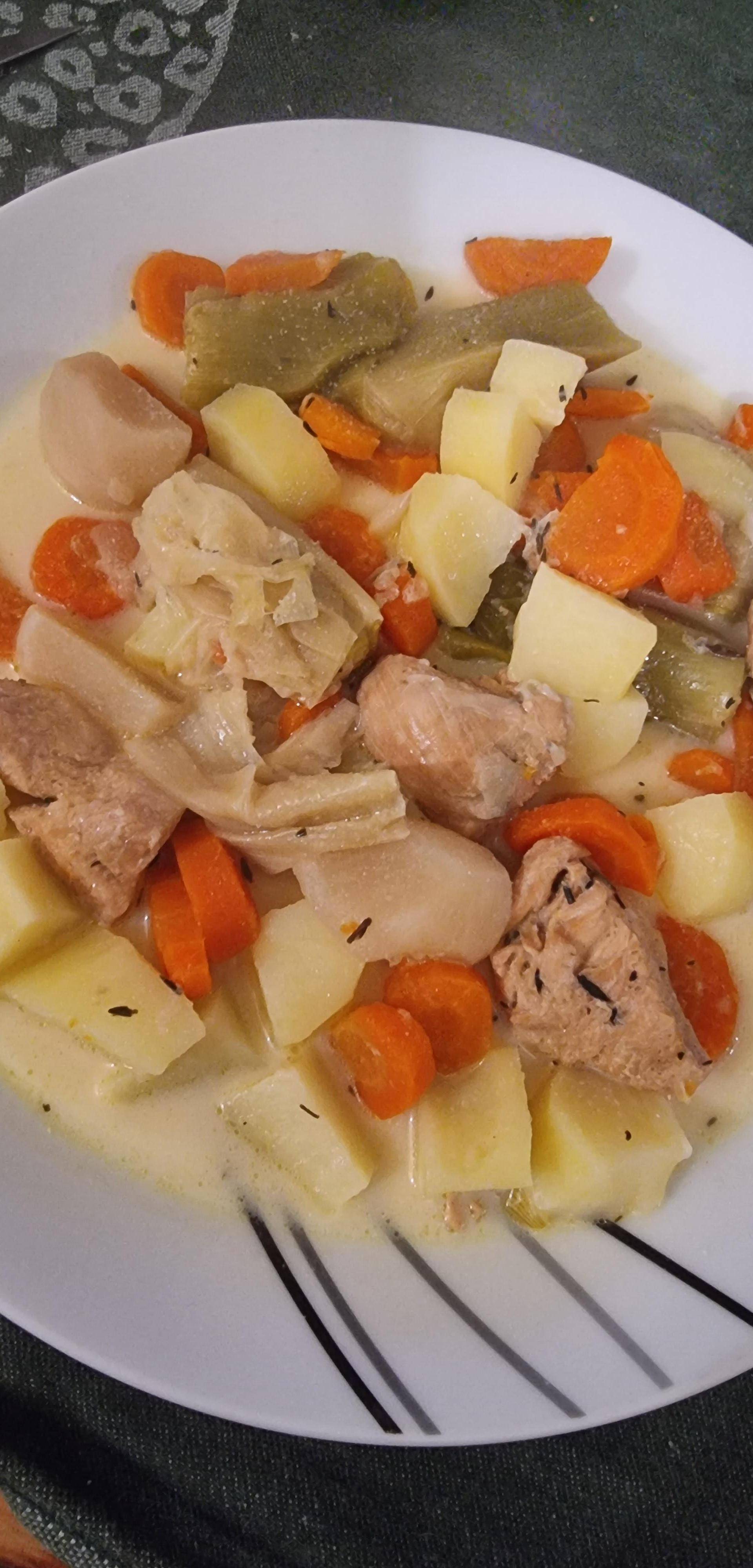 Mélanger les jaunes d'œufs avec la crème et les ajouter au bouillon, remettre la viande et les légumes et lancer le mode 2 à 3 min pour lier et épaissir la sauce. Vous pouvez utiliser de la maïzena si c'est trop liquide si vous voulez. Rectifier l'assaisonnement si nécessaire.