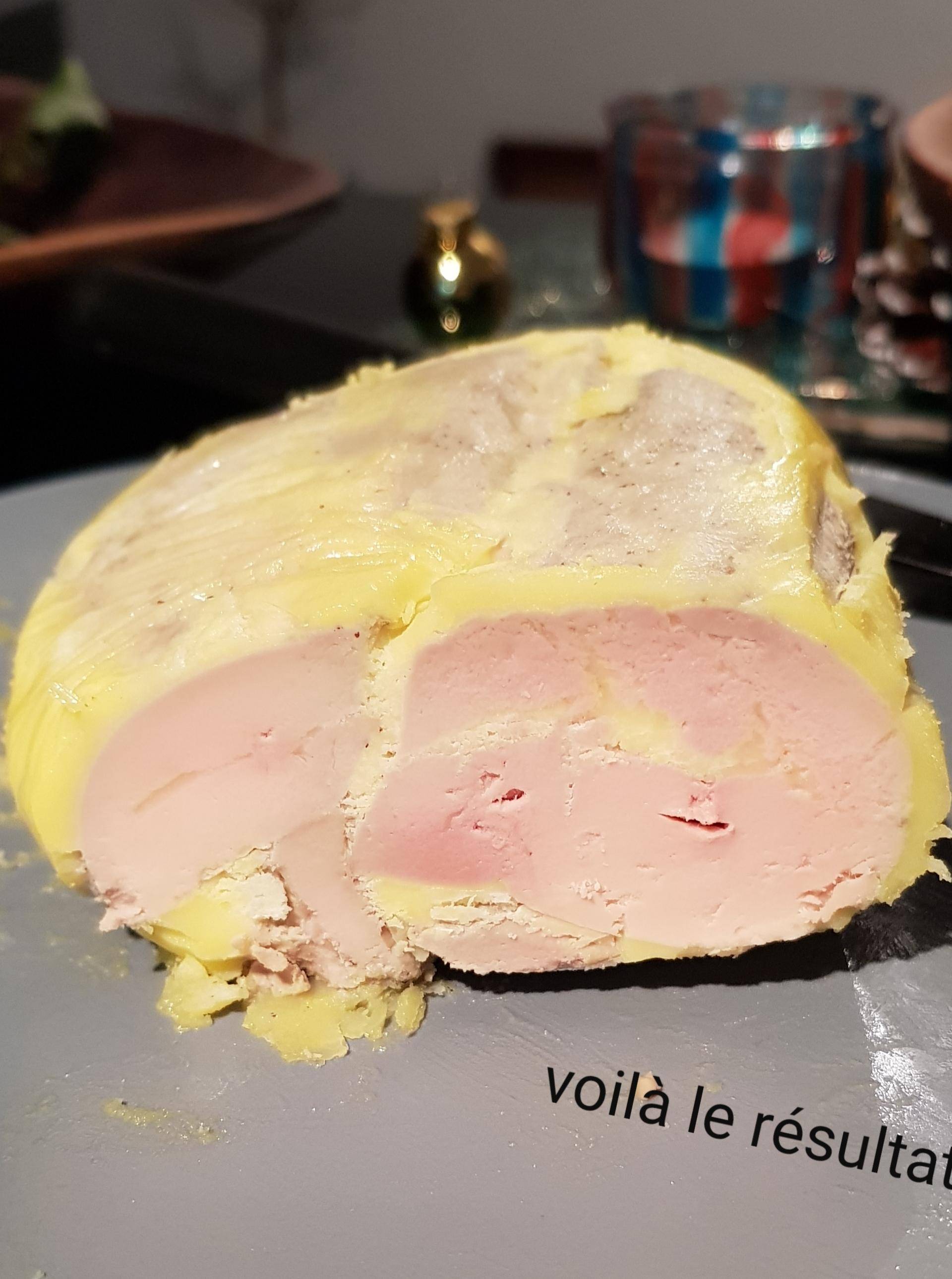 Étalez du film alimentaire sur le plan de travail et déposez 2 morceaux de foie gras, préalablement égoutté, dessus.