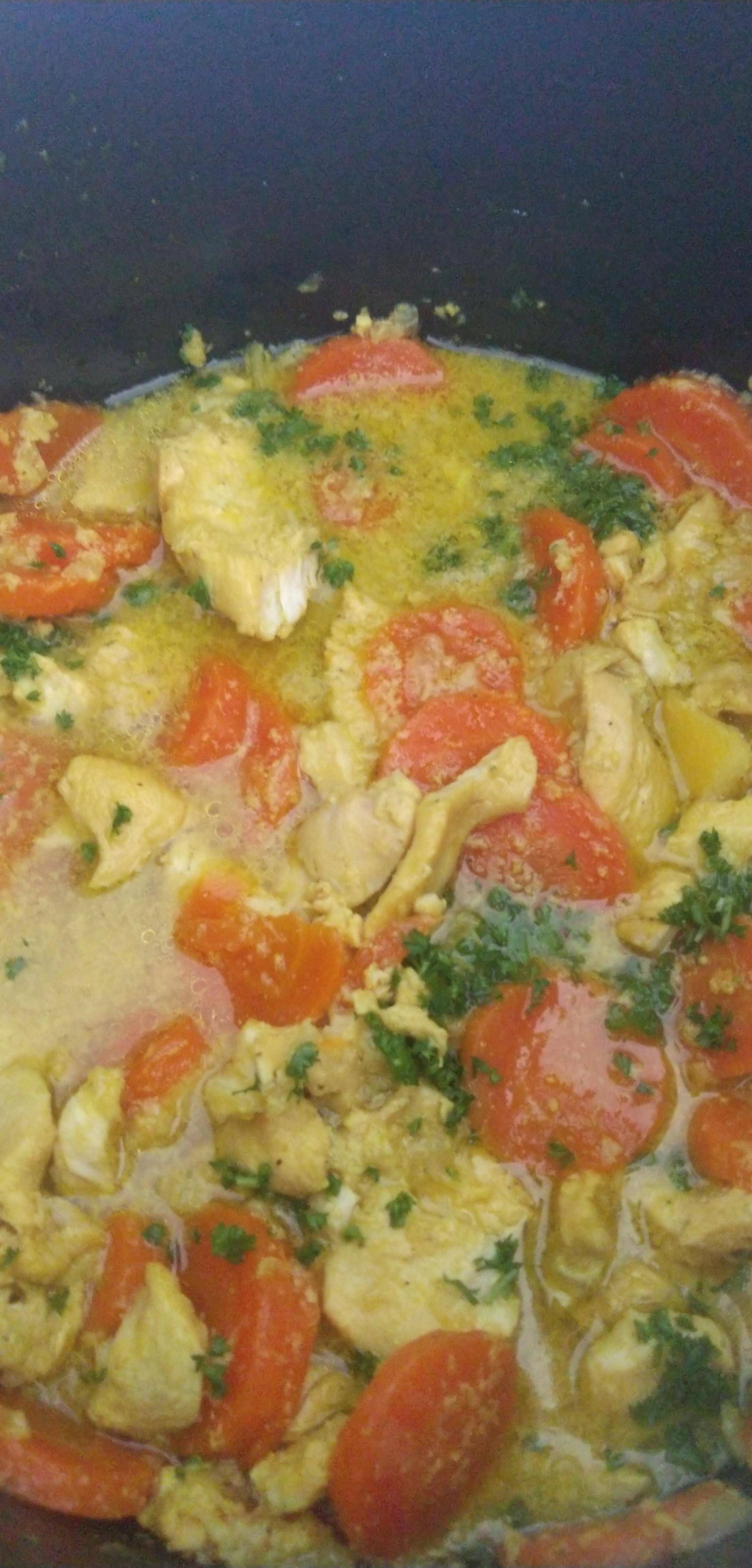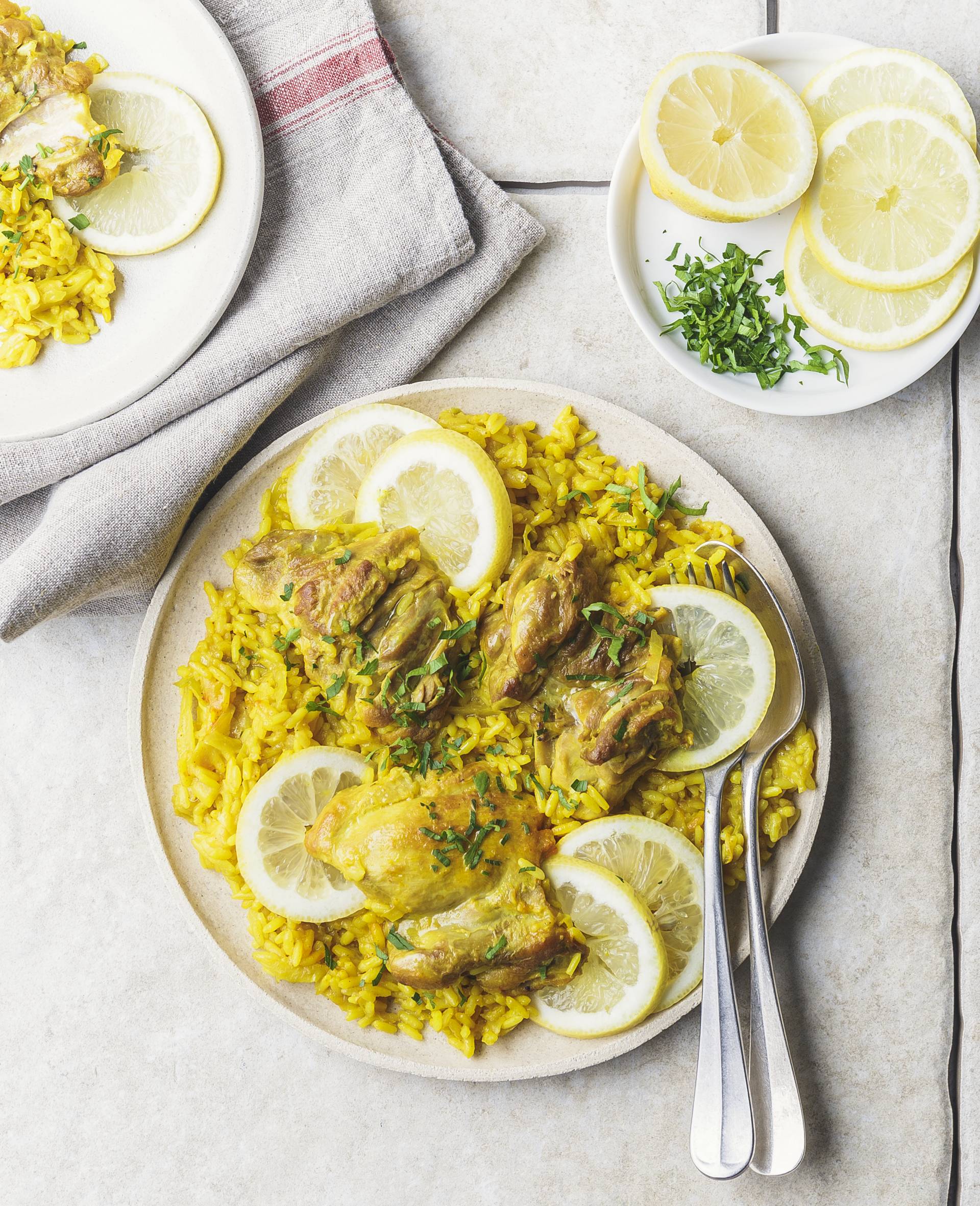Ajouter l’oignon, l’ail et les épices. Ajouter le chou et mélanger. Remettre le poulet. Ajouter le riz et le jus de citron. Verser l’eau.