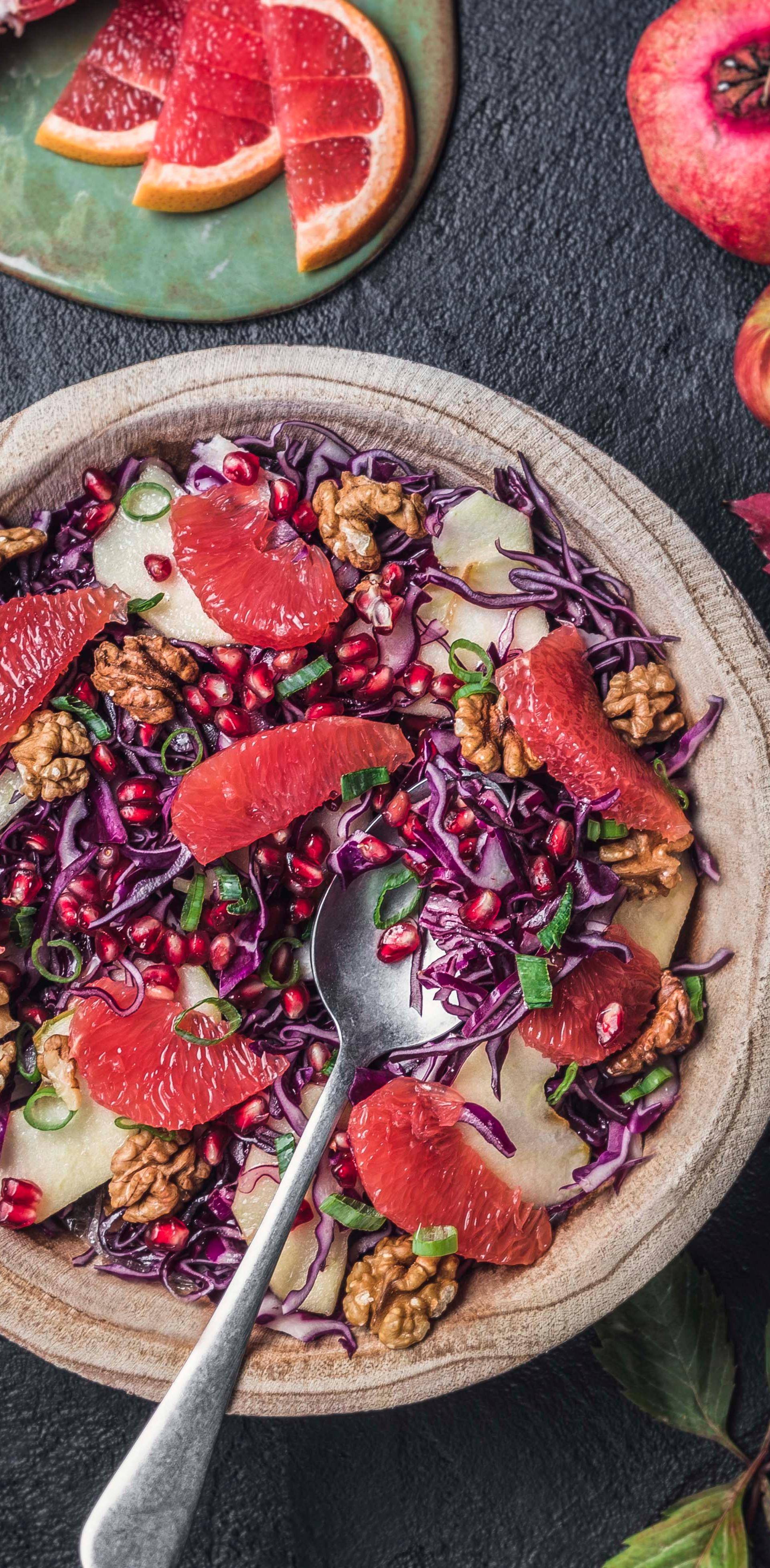 Ajoutez les grains de grenade et les suprêmes de pamplemousse dans le saladier. Mélangez tous les ingrédients.