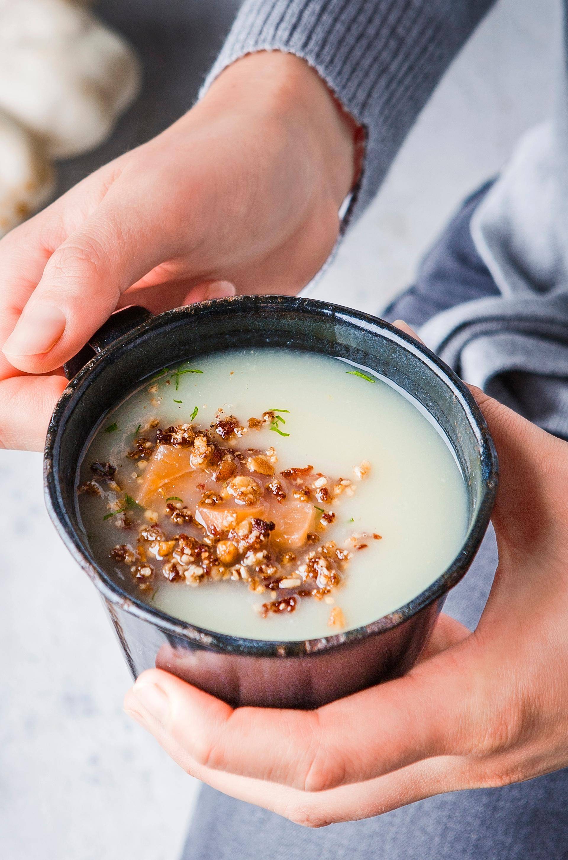 Coupez la truite fumée en dés. Servez les soupes de pâtisson avec quelques morceaux de truite fumée et saupoudrez de crumble de noix. Poivrez et servez aussitôt. Servez les soupes de pâtisson avec quelques morceaux de truite fumée et saupoudrez de crumble de noix et de persil ciselé.
